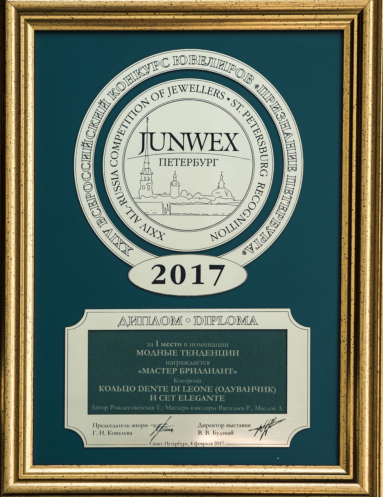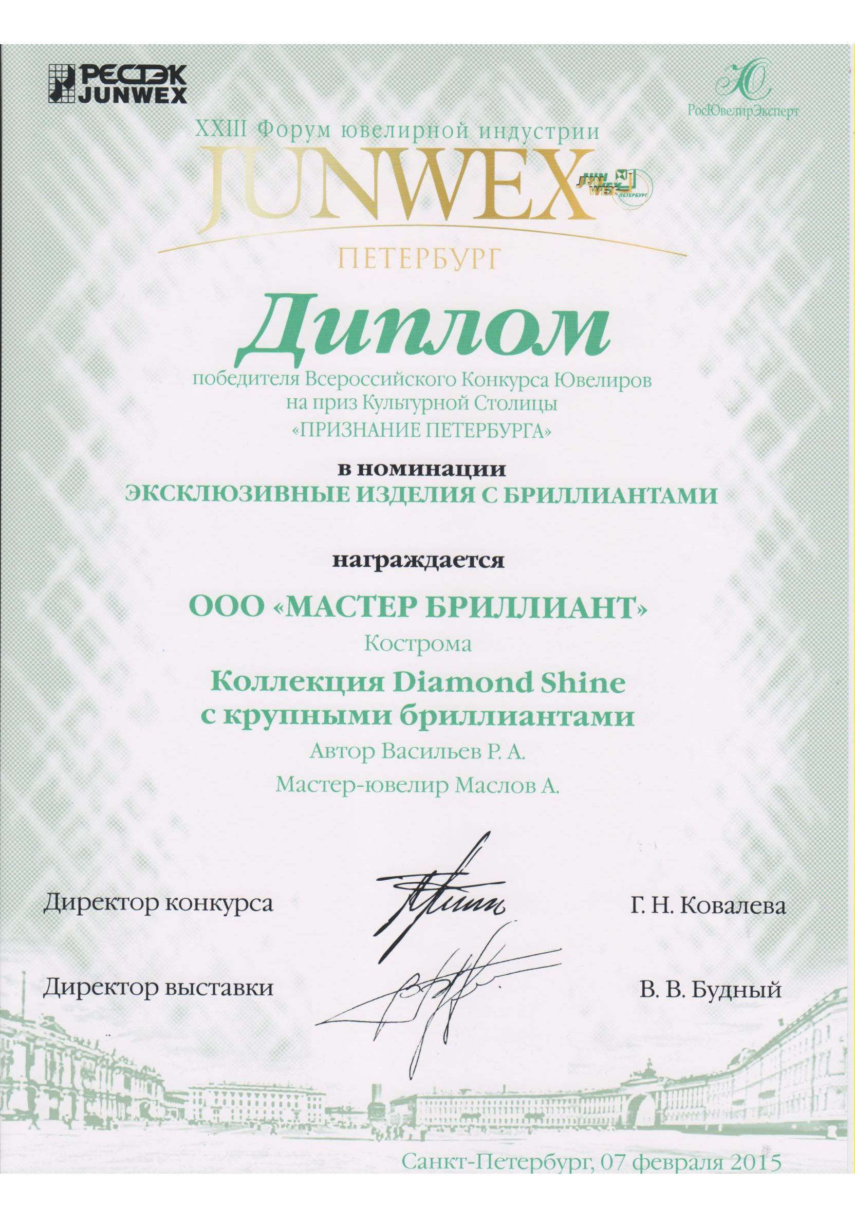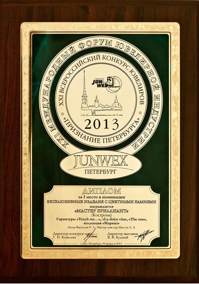 Диплом победителя Всероссийского Конкурса Ювелиров на приз Культурной Столицы «ПРИЗНАНИЕ ПЕТЕРБУРГА» JUNWEX ПЕТЕРБУРГ 2015