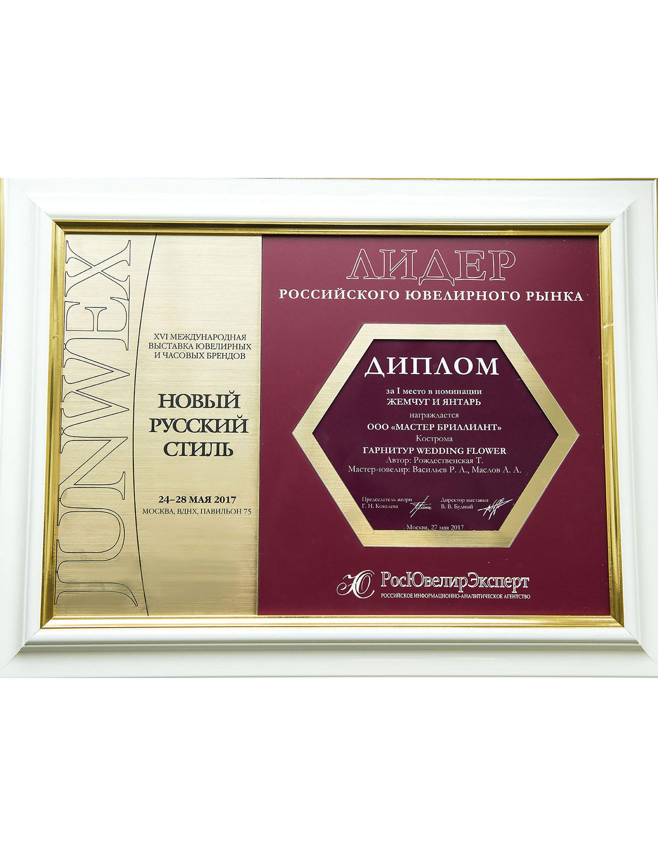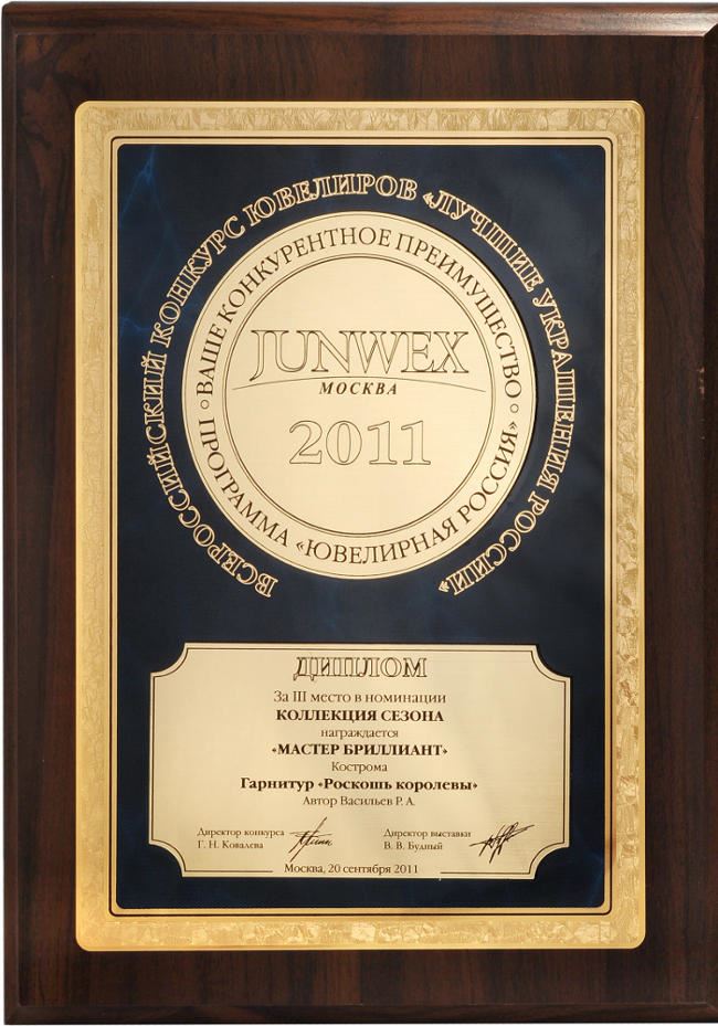 Диплом за I место в номинации "Коллекция драгоценностей" на выставке JUNWEX Новый Русский Стиль
