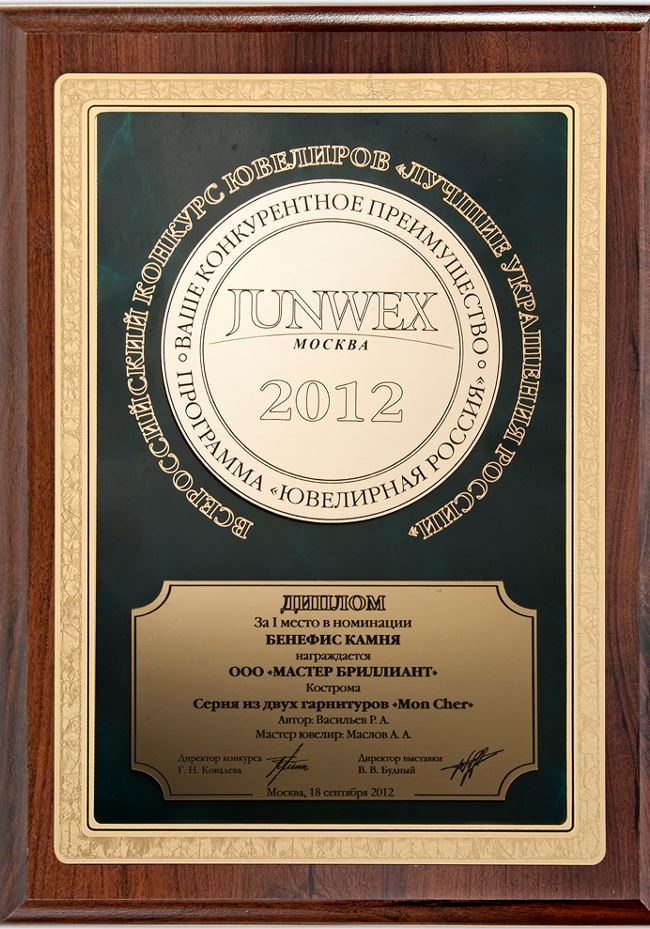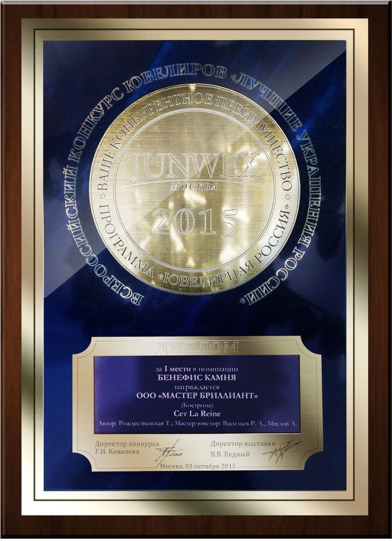Диплом за I место в номинации "Бенефис камня" на выставке JUNWEX МОСКВА 2015