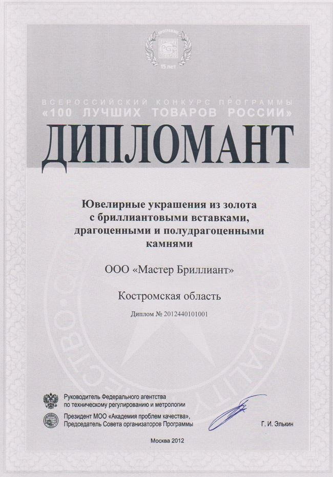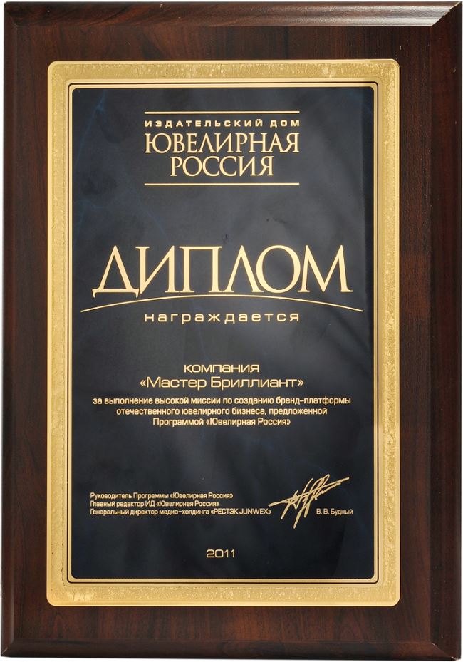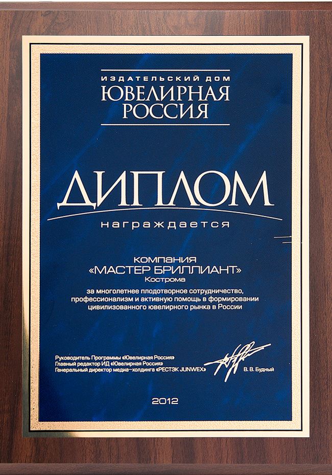 Диплом от издательского дома «Ювелирная Россия» 2012