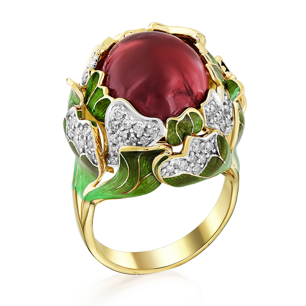 Кольцо жёлтое золото 585 пробы со вставками турмалин, эмаль, бриллиант