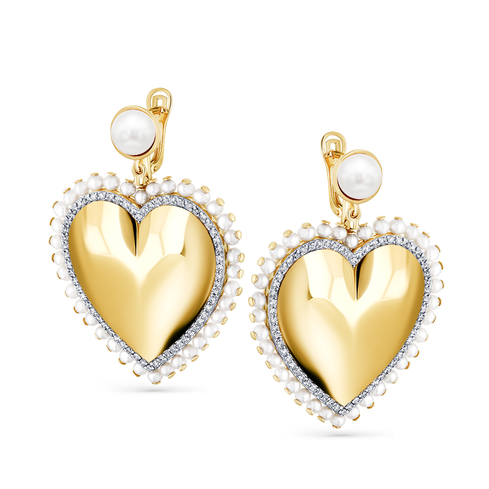 Серьги жёлтое золото 585 пробы со вставками жемчуг культивированный, жемчуг культивированный просв, бриллиант