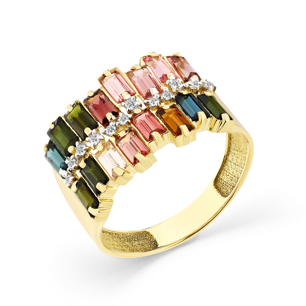 Кольцо жёлтое золото 585 пробы со вставками турмалин мультиколор, бриллиант арт. 1-308449-00-60