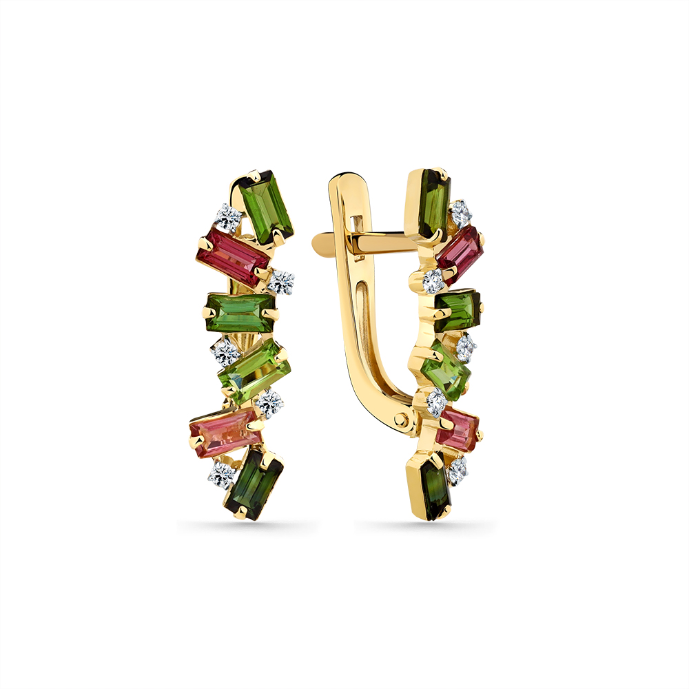 Кольцо жёлтое золото 585 пробы со вставками турмалин мультиколор, бриллиант