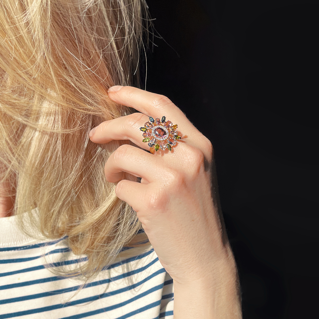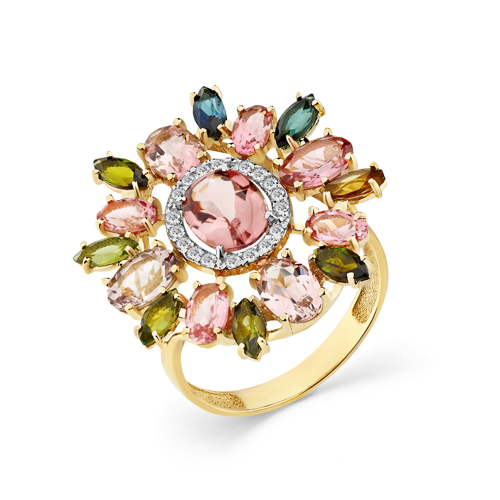 Кольцо со вставками турмалин мультиколор, турмалин розовый, бриллиант арт. 1-308452-00-60