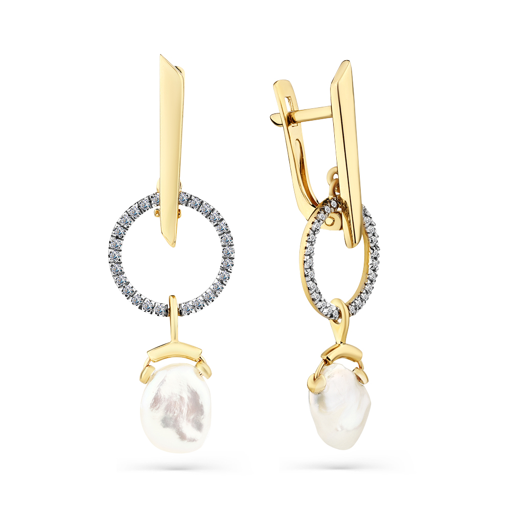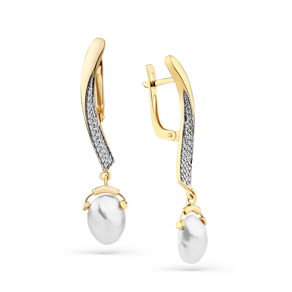 Серьги жёлтое золото 585 пробы со вставками жемчуг культивированный, бриллиант арт. 2-308446-00-28