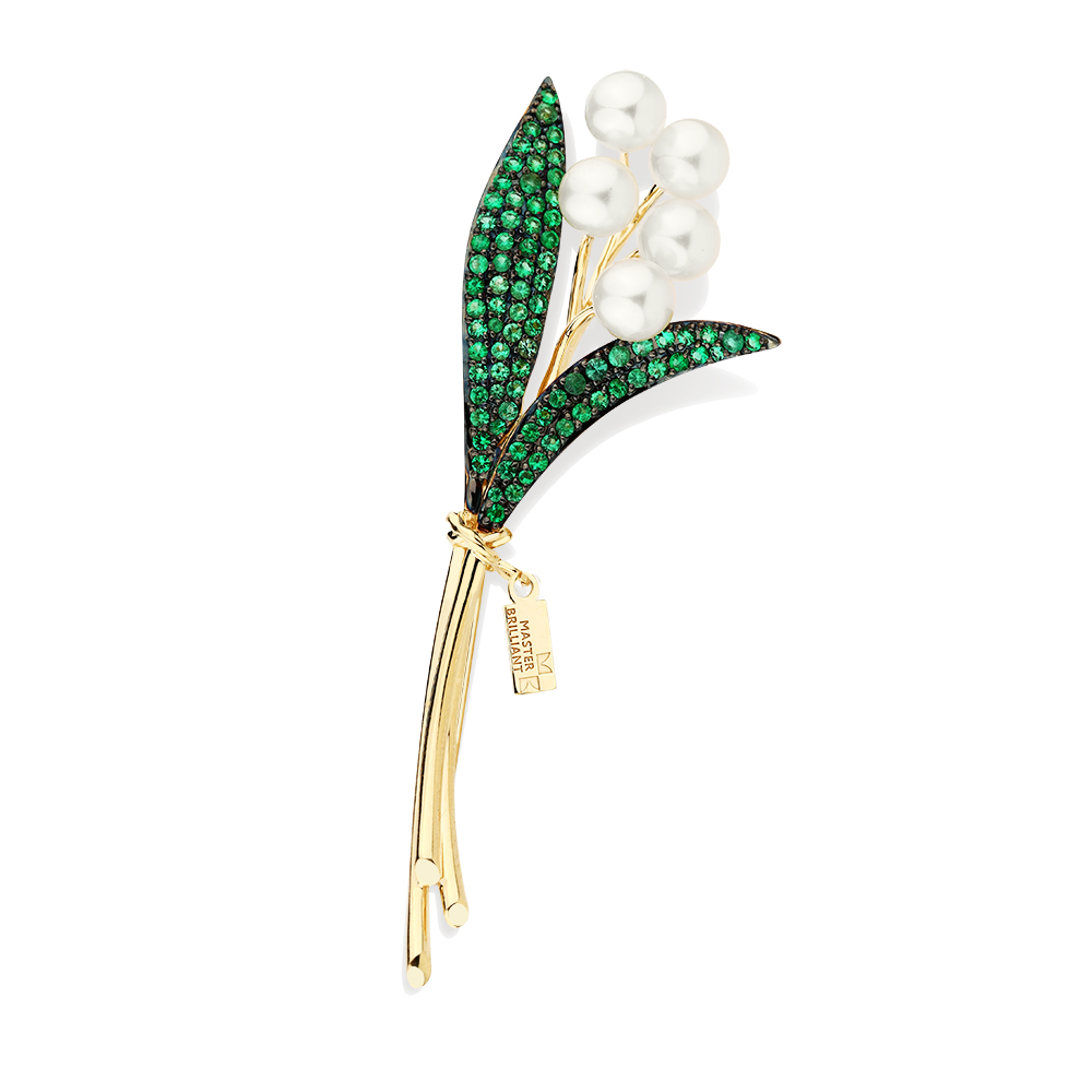 Брошь жёлтое золото 585 пробы со вставками жемчуг культивированный, изумруд н. арт. 7-370359-01-55