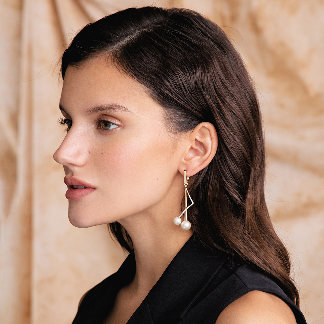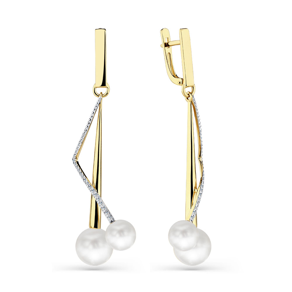 Серьги жёлтое золото 585 пробы со вставками жемчуг культивированный, бриллиант
