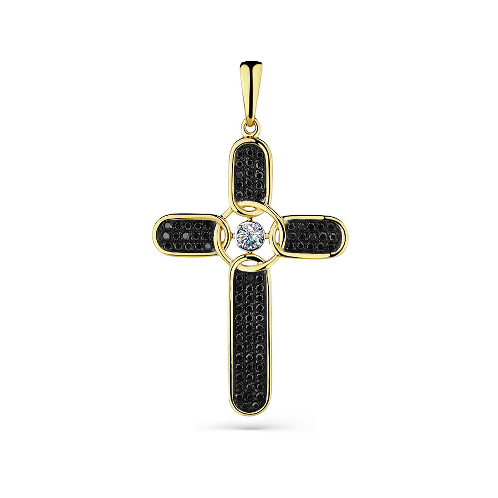 Крест жёлтое золото 585 пробы со вставками бриллиант черный, бриллиант