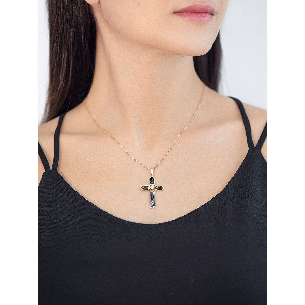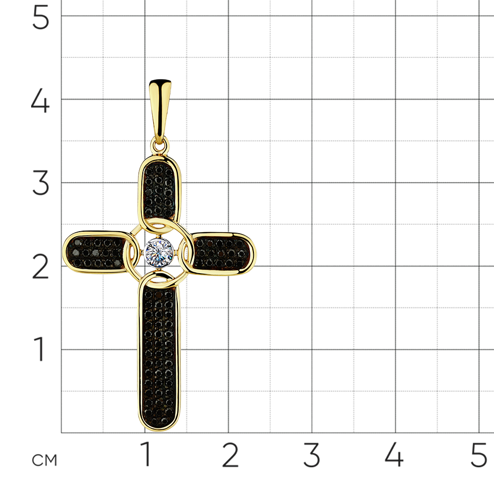 Крест жёлтое золото 585 пробы со вставками бриллиант черный, бриллиант арт. 8-380437-00-55