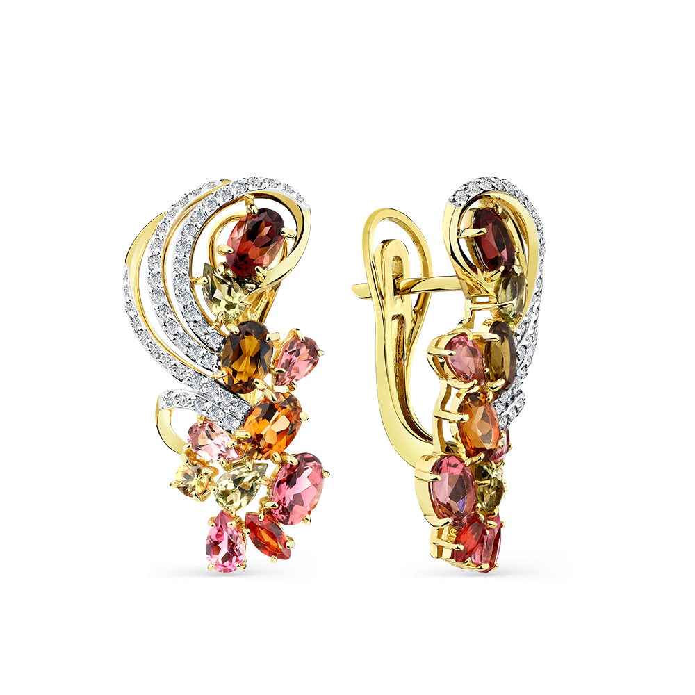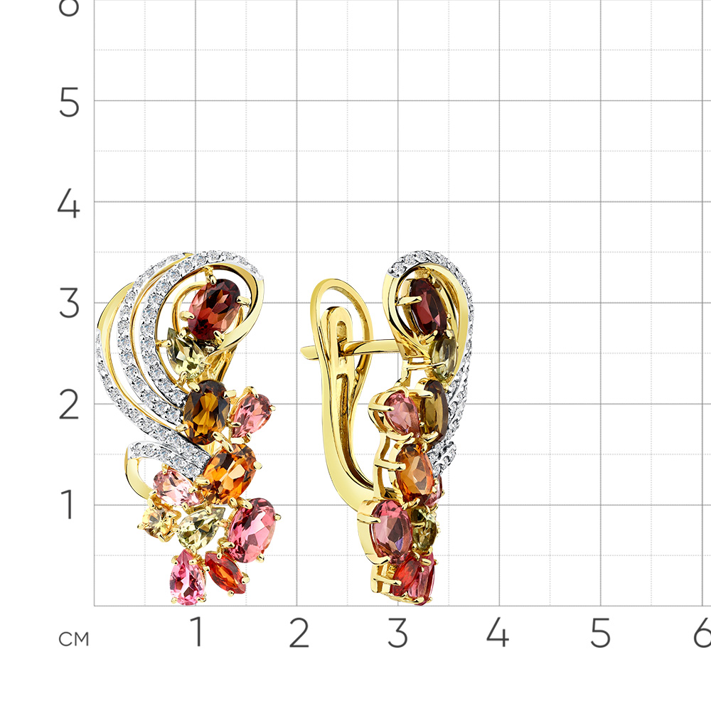 Серьги жёлтое золото 585 пробы со вставками турмалин мультиколор, бриллиант, сапфир облагороженный оранжевый, сапфир облагороженный желтый арт. 2-308816-00-55