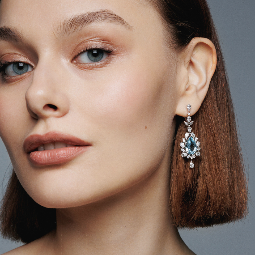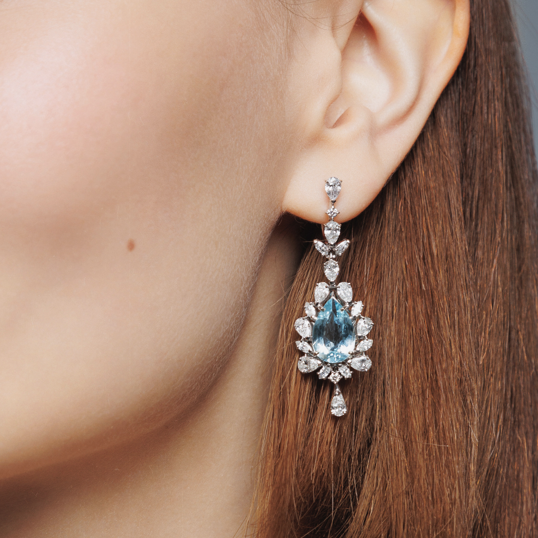 Серьги белое золото 585 пробы со вставками аквамарин, бриллиант