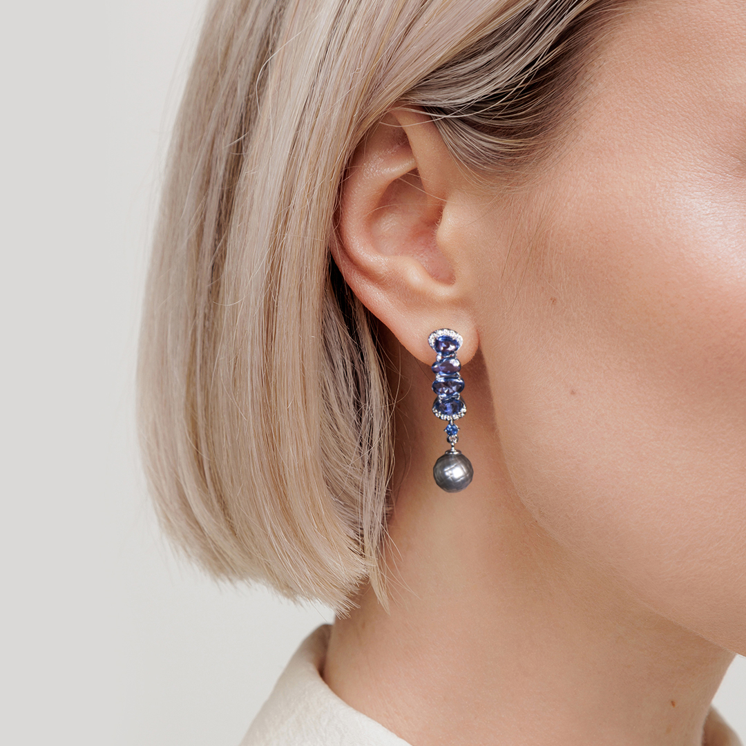 Серьги белое золото 585 пробы со вставками жемчуг культивированный морской, сапфир облагороженный голубой, сапфир облагороженный синий, бриллиант