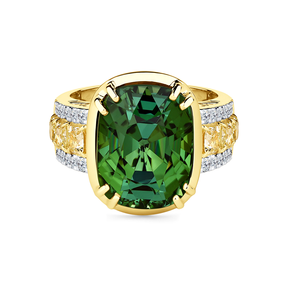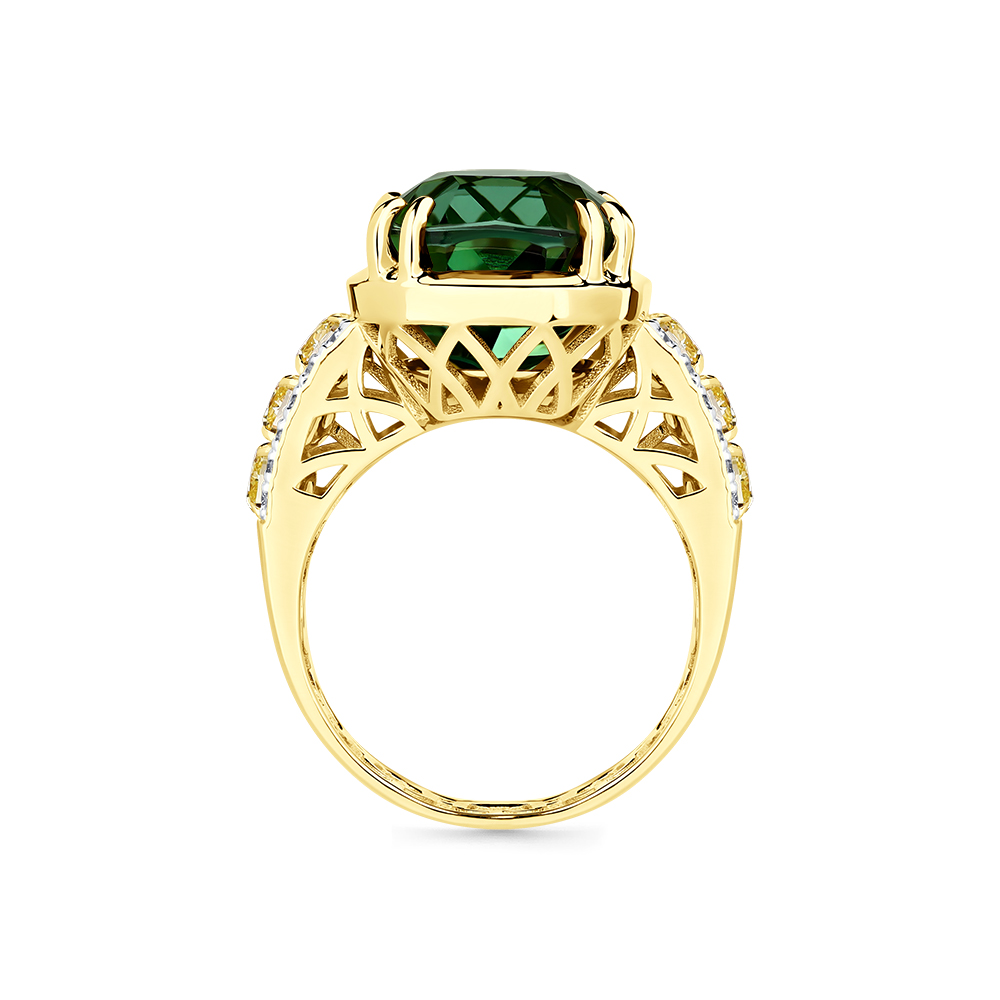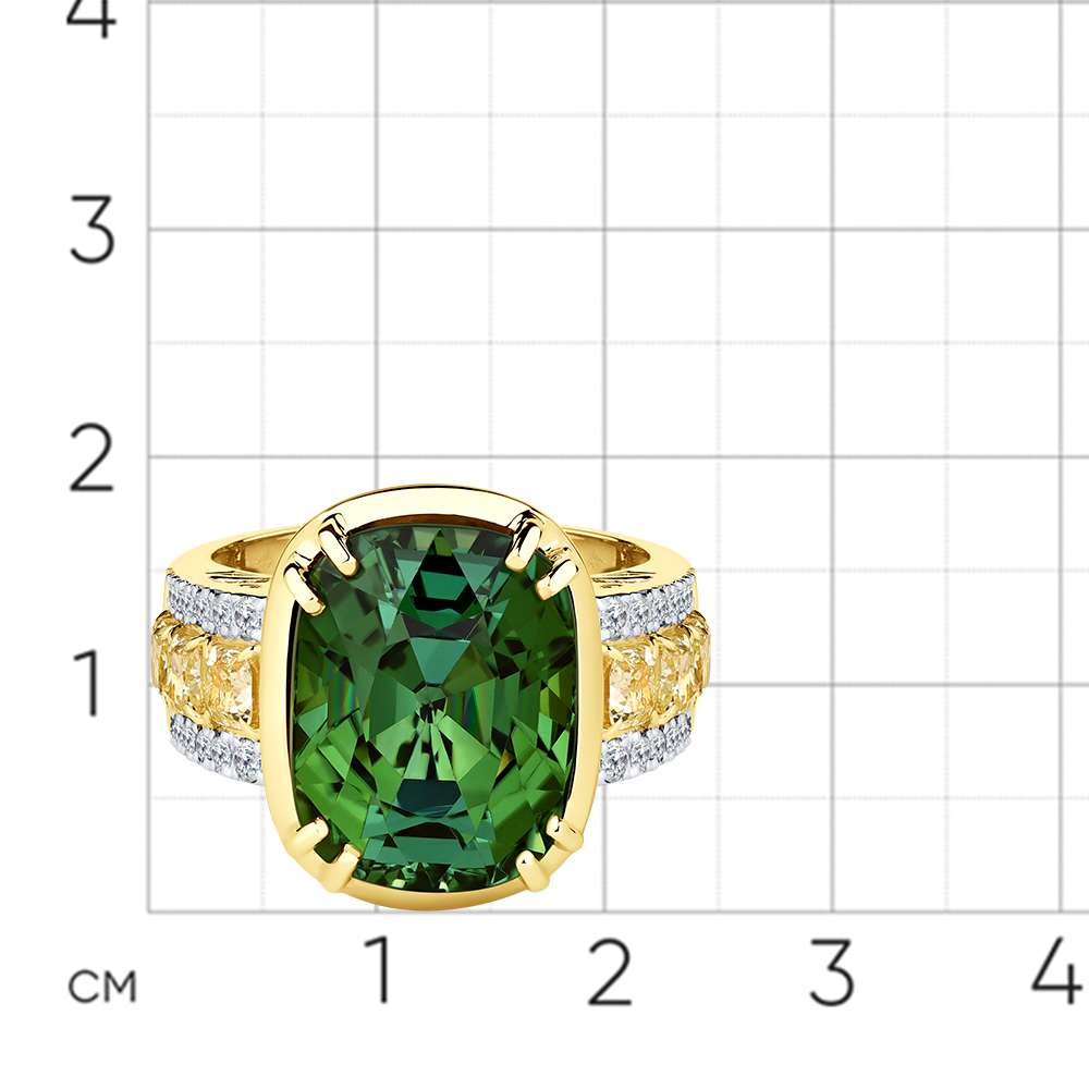 Кольцо жёлтое золото 585 пробы со вставками турмалин розовый, бриллиант лимонный, бриллиант арт. 1-308915-00-55