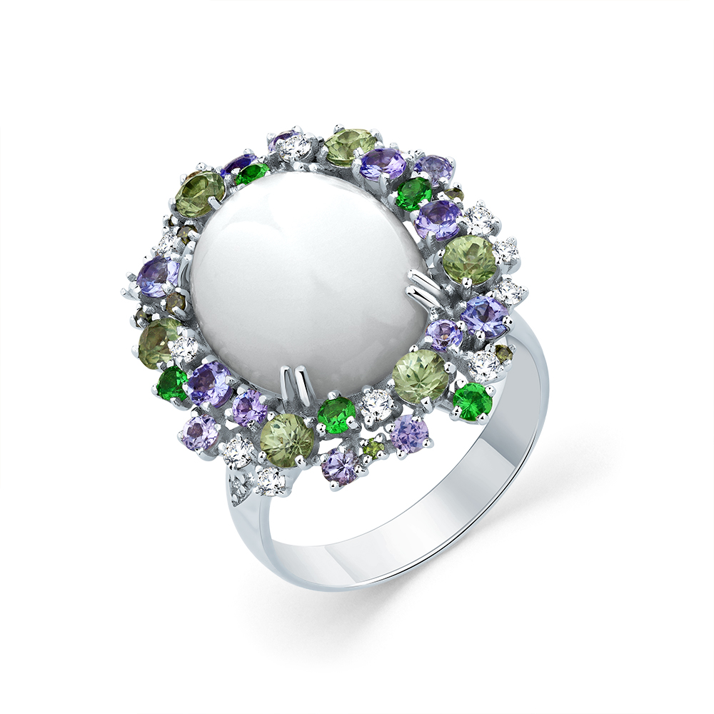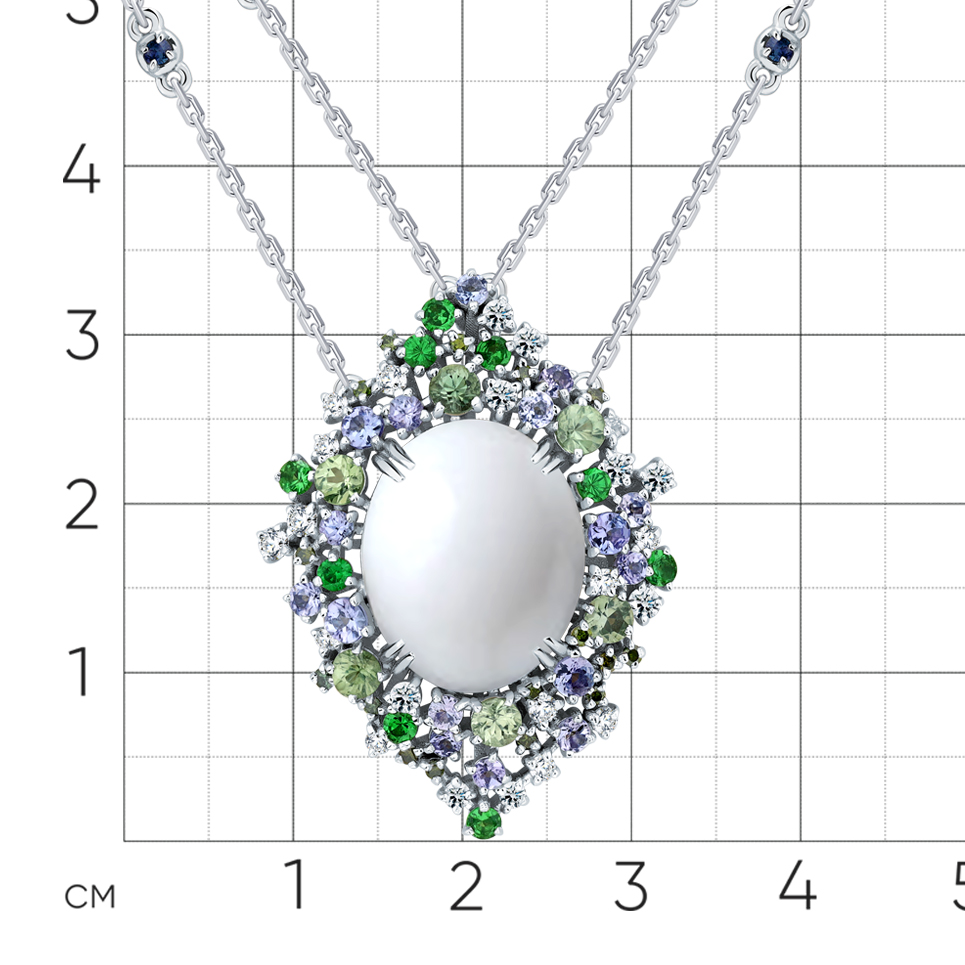 Колье белое золото 585 пробы со вставками агат белый, сапфир облагороженный зеленый, танзанит, цаворит, бриллиант, сапфир облагороженный синий, бриллиант зеленый арт. 6-260684-00-55