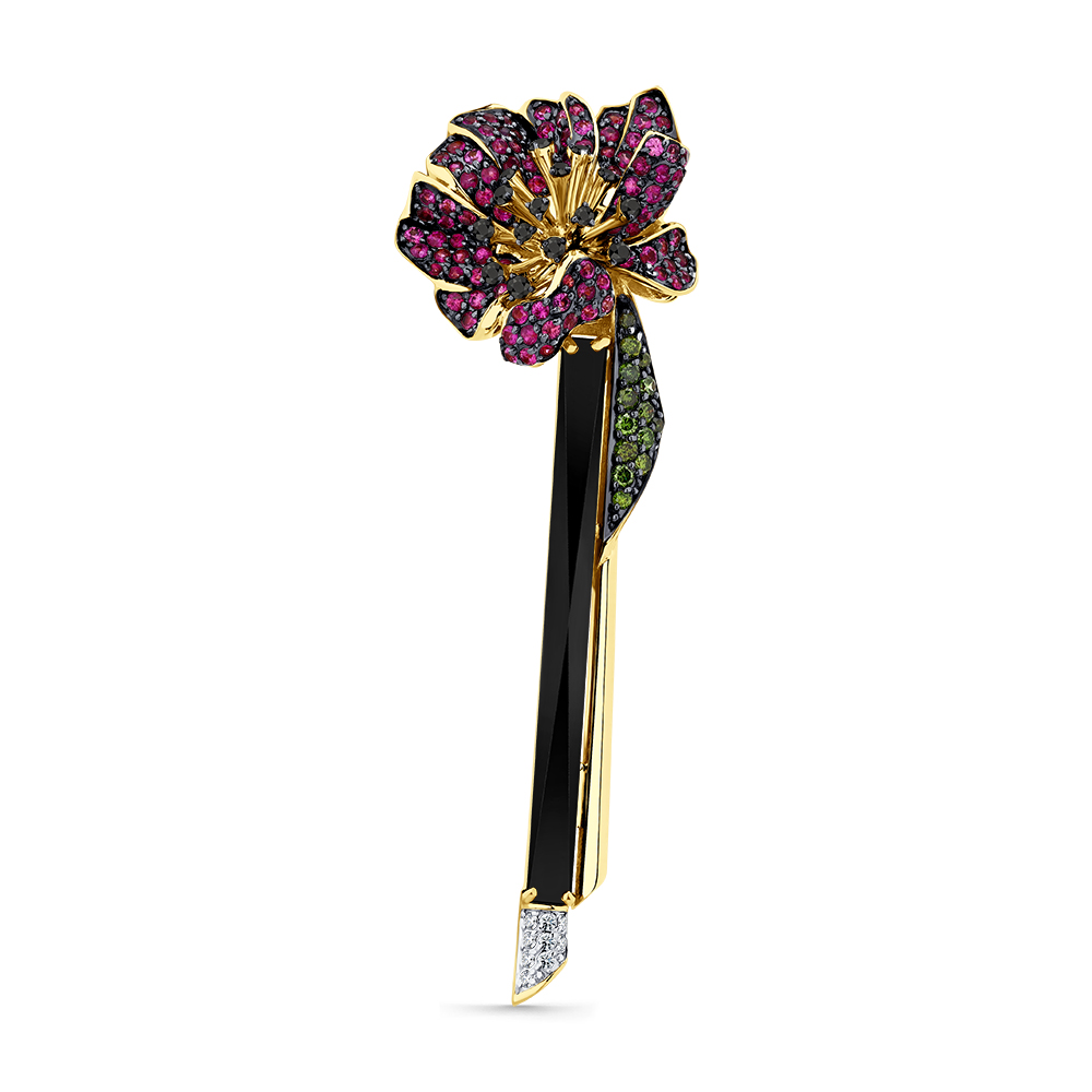 Брошь со вставками агат, рубин н., бриллиант зеленый, бриллиант черный, бриллиант